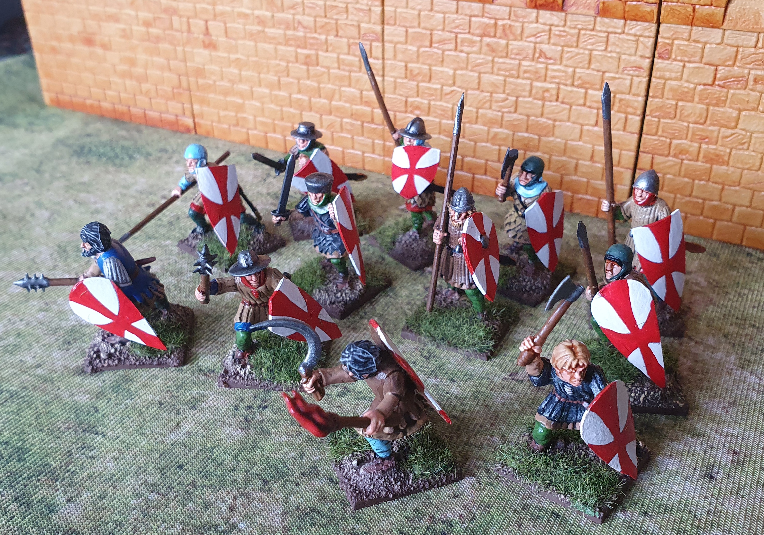 Piechota króla Aragonii Piotra II, szwagra hrabiego Tuluzy. Figurki FireForge 28 mm, tarcze malowane ręcznie. Ten oddział dołączy do sił Rajmunda VI w obleganej Tuluzie.